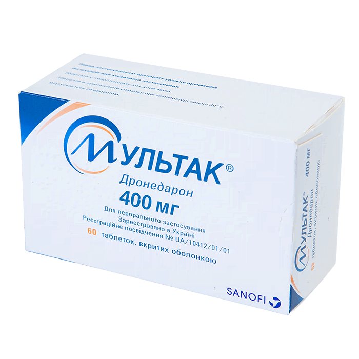 1 таблетка Мультак 400 мг содержит активное вещество: N-(2-Butyl-3-(p-(3-(dibutylamino)propoxy)benzoyl)-5-benzofuranyl) methanesulfonamide.
