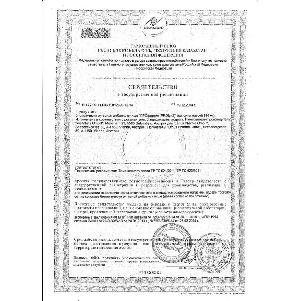 Профертил представляет собой комплекс витаминов для улучшения репродуктивной способности у мужчин. После курса приема препарата все показатели спермограммы заметно улучшаются или полностью возвращаются к норме. L-карнитин образуется в организме и обеспечивает энергетическим субстратом клетки, продуцирующие сперматозоиды. L-Карнитин улучшает подвижность и качество сперматозоидов. L-Аргинин - аминокислота, которая необходима человеческому организму в больших количествах. Доказано влияние ее на улучшение качества и подвижности сперматозоидов. Коэнзим Q 10 увеличивает оплодотворяющую функцию и качество спермы, равно как и подвижность сперматозоидов. Витамин Е улучшает подвижность сперматозоида и усиливает способность сперматозоида внедряться в яйцеклетку. Цинк способствует усилению плотности сперматозоида, увеличению числа быстро двигающихся сперматозоидов и увеличения уровня тестостерона, который важен для сперматогенеза. Фолиевая кислота жизненно необходима для продуцирования и деления клеток, кроветворения и метаболизма в нервных клетках. Также является протектором коронарной системы. Глутатион и Селен высокоэффективны для связывания свободных радикалов. При их применении отмечалось значительное улучшение подвижности спермы.