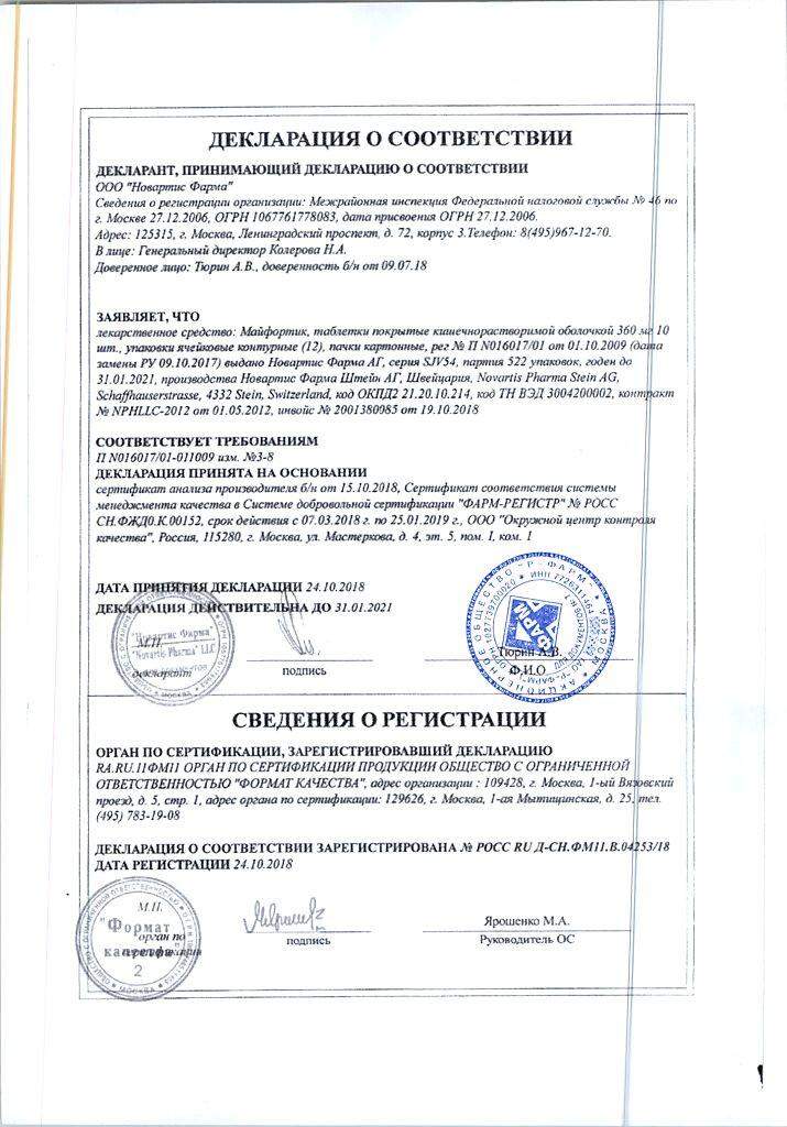 Майфортик - иммунодепрессивное средство. Препарат Майфортик ингибирует синтез гуанозиновых нуклеотидов посредством селективного подавления ключевого фермента синтеза пуринов — инозинмонофосфатдегидрогеназы. Благодаря данному механизму эффективно подавляет пролиферацию Т- и В-лимфоцитов, причем в значительно большей степени, чем других клеток, поскольку пролиферация лимфоцитов зависит в основном от синтеза пуринов de novo. Подавление пролиферации Т- и В-лимфоцитов препаратом Майфортик дополняет действие ингибиторов кальциневрина, нарушающих продукцию цитокинов и воздействующих на Т-лимфоциты в фазе покоя клеточного цикла.