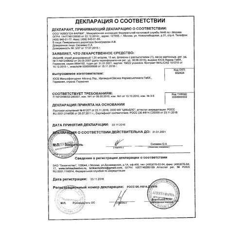 Особые указания. При первом применении и в том случае, когда после последнего использования Изокет спрея прошло больше суток, следует при первом нажатии на распылитель направить брызги в воздух, поскольку они могут не содержать полную дозу.