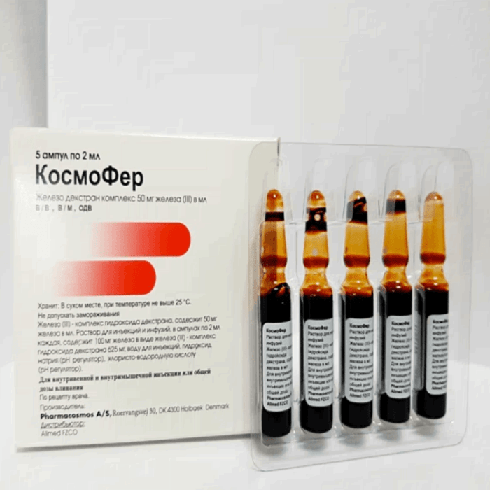 Форма выпуска. Раствор для инъекций темно-коричневого цвета. КосмоФер, также используется при невозможности перорального приема.